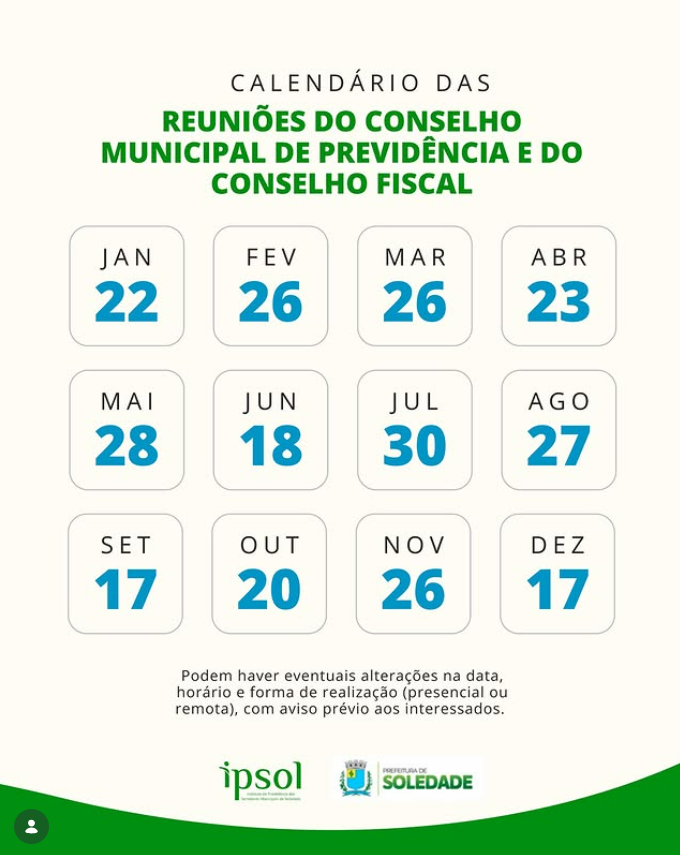 O calendário de reuniões do Conselho Municipal de Previdência e do Conselho Fiscal já está definido. As reuniões ocorrerão sempre na última quinta-feira de cada mês, às 8h, no IPSOL. Caso haja alterações de data, horário ou formato (presenciais ou remotas), estas serão comunicadas com antecedência.