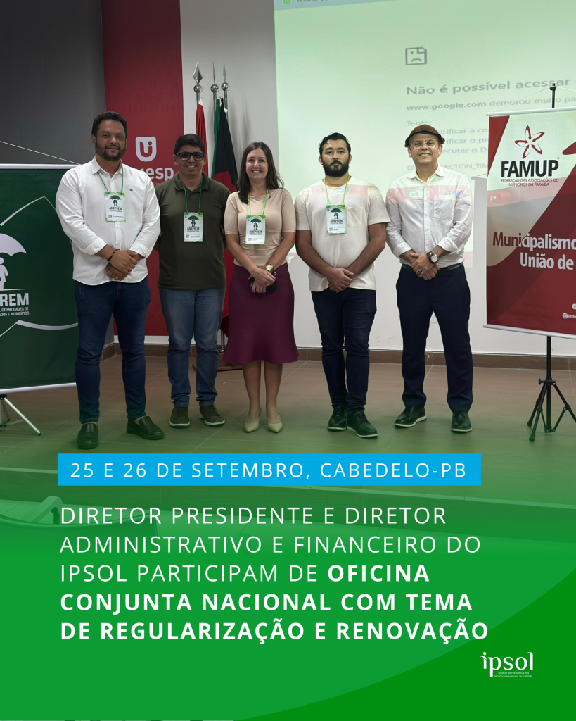 O Diretor Presidente do IPSOL, Guilherme Souto Batista, e o Diretor Administrativo e Financeiro, Felipe Cordeiro, marcaram presença na Oficina Conjunta Nacional – CRP: Regularização e Renovação, realizada nos dias 25 e 26 de setembro, no Auditório da UNIESP – Cabedelo/PB, promovida pela FAMUP, ANEPREM E ASPREVPB.