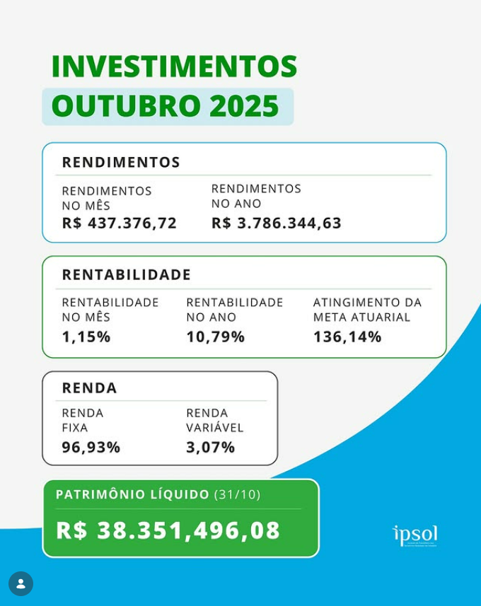 Em outubro de 2025, os investimentos do IPSOL registraram rendimento de R$ 437.376,72 no mês e R$ 3.786.344,63 no acumulado do ano. A rentabilidade mensal foi de 1,15%, enquanto a rentabilidade anual atingiu 10,79%, com atingimento da meta atuarial em 136,14%.