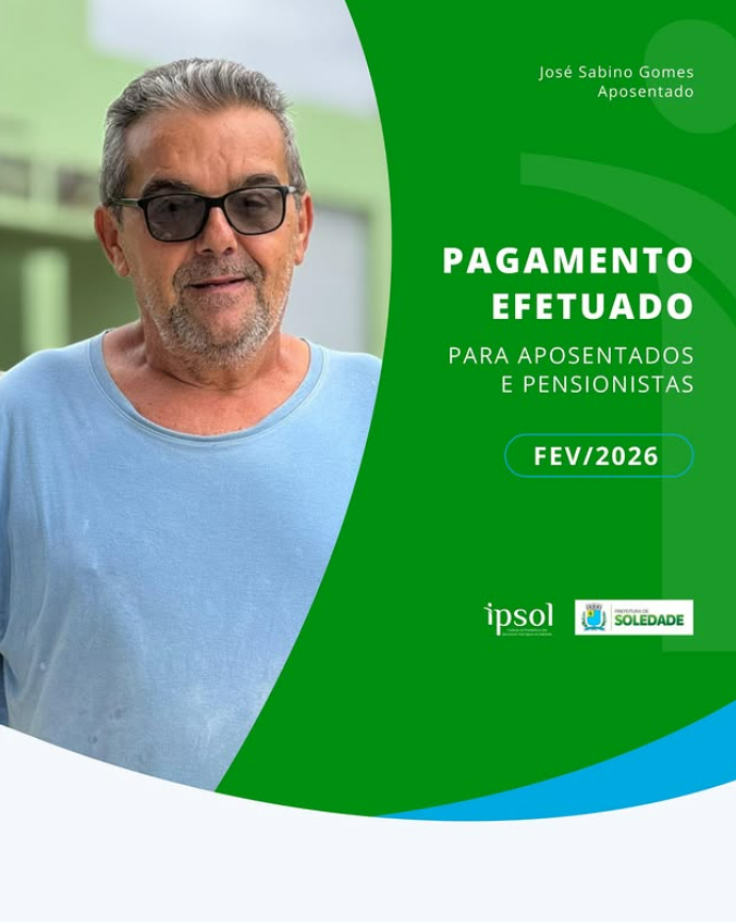 O Instituto de Previdência dos Servidores de Soledade – IPSOL, através do Agente de Vigilância Sanitária aposentado, José Sabino, anuncia o pagamento para aposentados e pensionistas referente ao mês de Fevereiro de 2026.