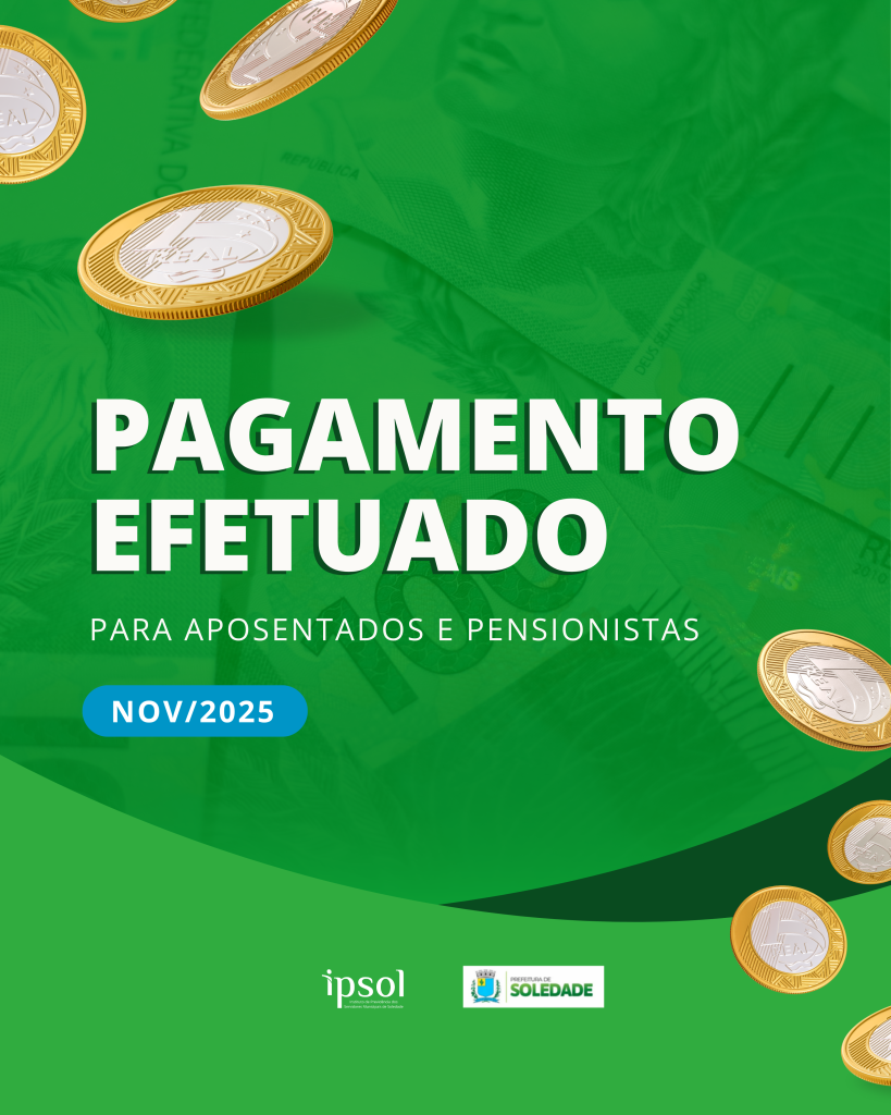 O Instituto de Previdência dos Servidores de Soledade – IPSOL informa que o pagamento dos aposentados e pensionistas referente ao mês de Novembro de 2025 foi realizado com sucesso!